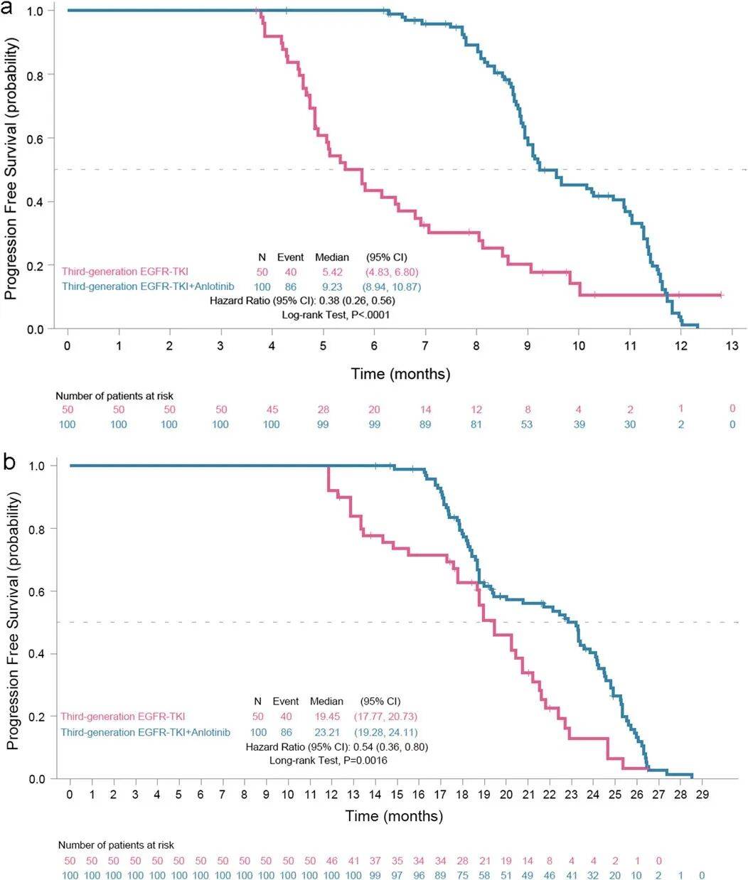 截至数据截止日期(2024年11月20日),从患者缓慢/局部/寡进展开始用药之日起,EGFR-TKIs联合安罗替尼组的中位PFS为9.23个月(95% CI, 8.94–10.87个月),而EGFR-TKIs组为5.42个月(95% CI, 4.83–6.80个月),达到了主要研究终点,详见图2a。在EGFR-TKIs中加入安罗替尼可使疾病进展风险降低62%(HR=0.38, 95% CI 0.26-0.56; P<0.0001)。同时,从针对原发疾病的用药开始日期到数据截止日期计算,EGFR-TKIs联合安罗替尼组的中位PFS为23.21个月(95% CI, 19.28–24.11个月),而EGFR-TKIs组为19.45个月(95% CI, 17.77–20.73个月),疾病进展风险降低46%(HR=0.54, 95% CI 0.36-0.80, P=0.0016),详见图2b。