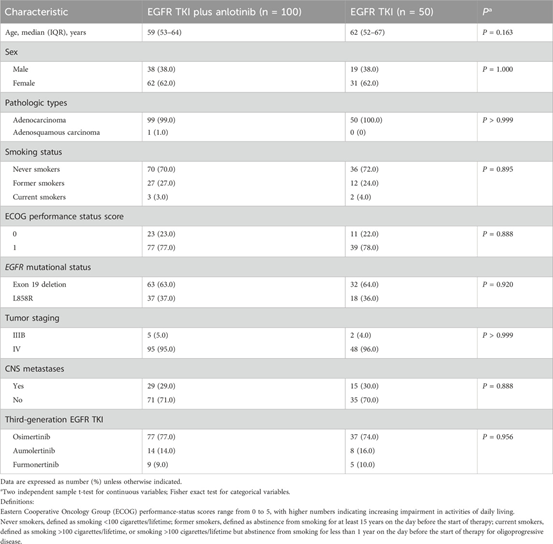 该研究共筛查712名患者,150名患者符合研究条件,三代EGFR-TKIs治疗缓慢/局部/寡进展后接受三代EGFR-TKIs联合安罗替尼组100例,继续原三代EGFR-TKIs组50例,详见图1。联合治疗组的中位年龄为59岁,38.0%为男性,大多数患者(95.3%)处于临床IV期,44名(29.3%)患者存在脑转移。总人群中,95例(63.3%)患者存在EGFR 19号外显子缺失突变,55名(36.7%)患者存在EGFR 21号外显子L858R突变。既往接受的第三代EGFR-TKIs治疗包括奥希替尼( 76.0%,114/150 )、阿美替尼( 14.7%,22/150 )和伏美替尼( 9.3%,14/150 )。两组患者的人口统计学特征和基线特征均衡良好,详见表1。