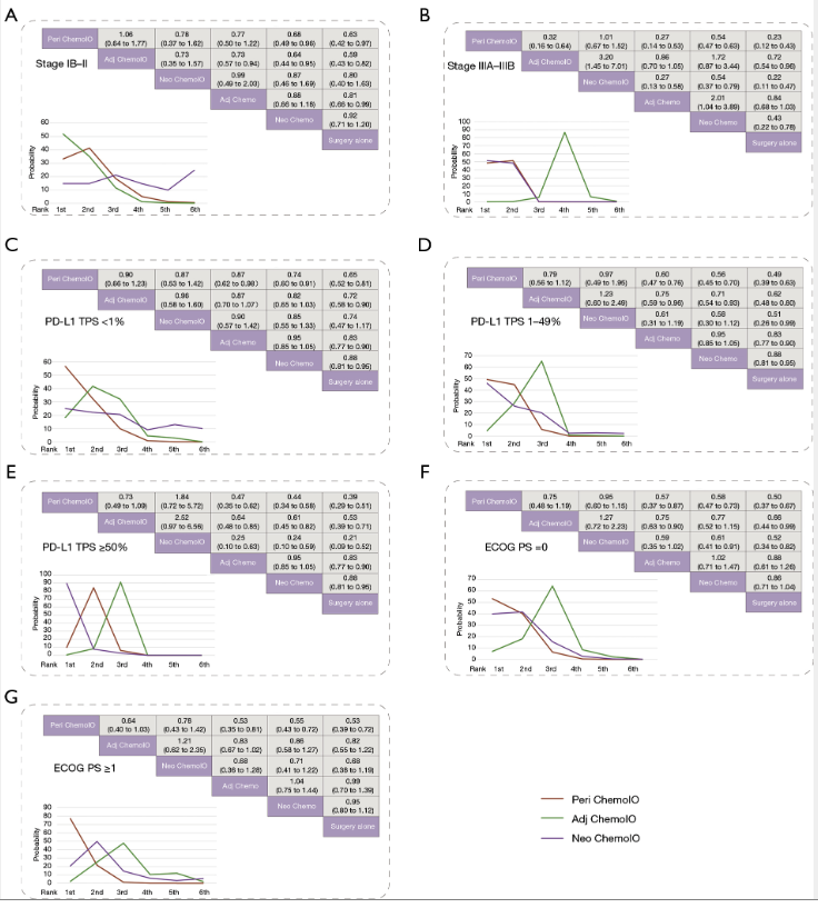 就OS而言,围手术期免疫化疗较辅助免疫化疗也与OS改善相关(P=0.042),但与新辅助免疫化疗相当(P=0.77)。围手术期免疫化疗最有可能延长OS(60.43%),其次是新辅助免疫化疗和辅助免疫化疗。