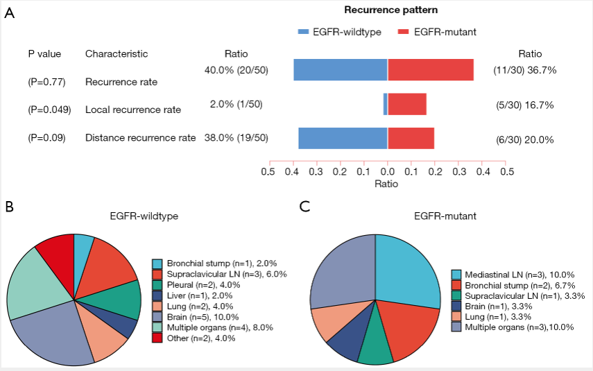 就局部复发(LR)而言,EGFR突变型组的LR率显著高于EGFR野生型组(16.7% vs.2.0%,P=0.049)。两组在纵隔淋巴结复发和支气管残端复发以及各种远处转移(如锁骨上淋巴结、胸膜、肝、脑、肺转移及多器官转移)的发生率上均无统计学差异。