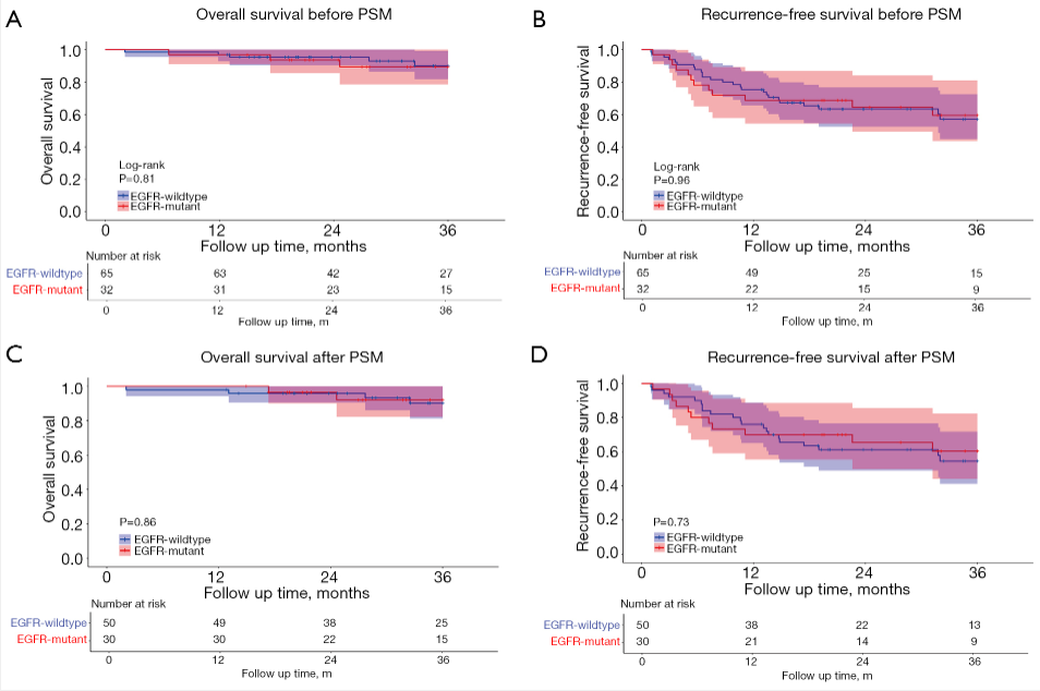 图1 EGFR野生型与EGFR突变型患者在倾向性评分匹配(PSM)前和匹配后的OS