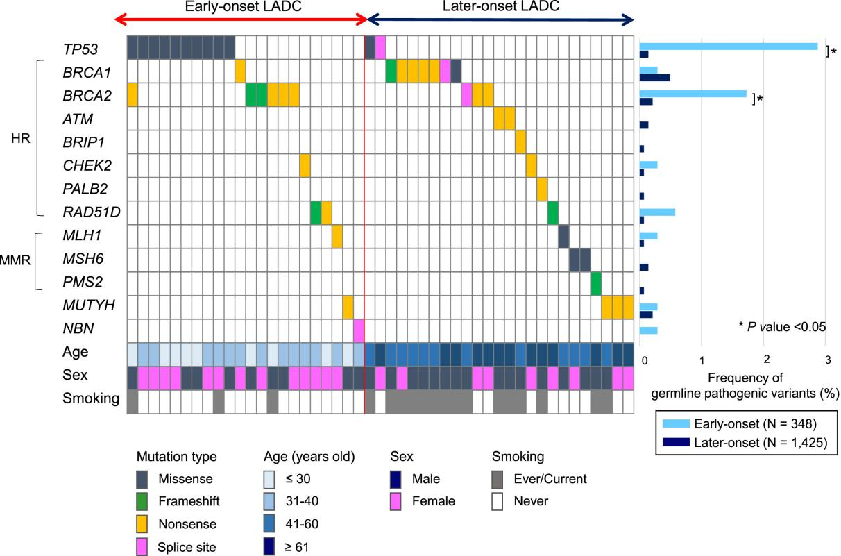 图1 25个遗传性癌症易感基因致病变异的分布,以及早发型和晚发型肺腺癌患者的特征