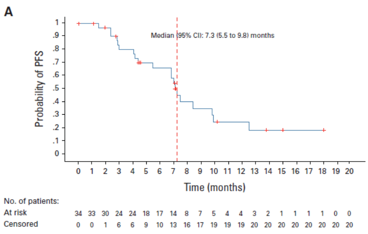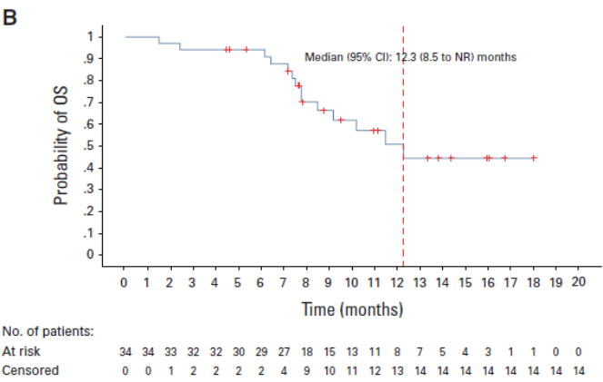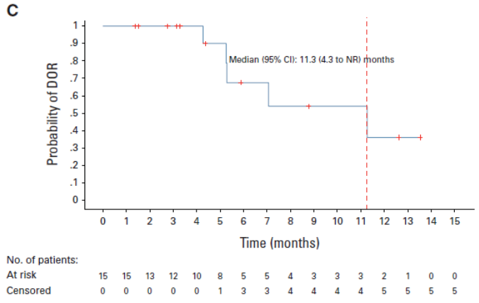 值得注意的是, 在既往仅接受过1线化疗(含铂化疗或ADC)进展的15例患者中,ORR与确认的ORR均为80.0%(95%CI:51.9-95.7),DCR 100%,中位PFS未达到,6个月PFS率为100%,提示更早使用iza-bren可能为患者带来更大获益