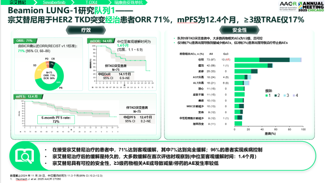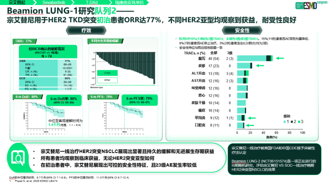 基于Beamion Lung-1研究及真实世界数据,宗艾替尼在初治患者中展现出持久疗效:ORR高达77%,6个月PFS率达79%,且无论HER2突变亚型如何均能快速起效(中位至客观缓解时间仅1.4个月);同时,在经治患者中展现出突破性疗效:ORR为71%,中位PFS达12.4个月,显著优于现有标准治疗(如化疗联合免疫,ORR普遍低于50%)。安全性方面,宗艾替尼凭借对HER2的高选择性,保留野生型EGFR功能,皮疹、腹泻发生率显著较低,耐受性良好。