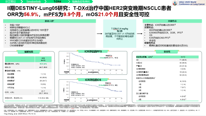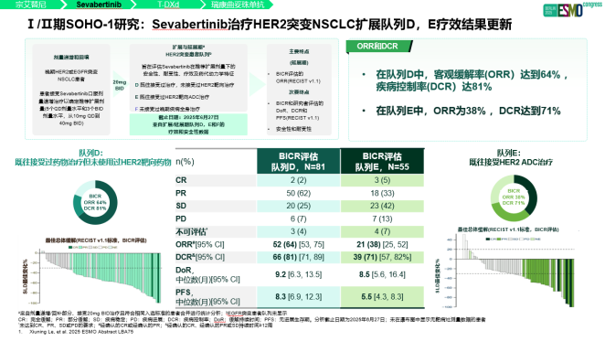与此同时,其他新型药物亦取得突破性进展。2025年ESMO更新的SOHO-1扩展队列则进一步证实,Sevabertinib在既往接受过治疗但未接受过HER2靶向治疗(队列D)及ADC经治(队列E)患者中ORR分别为64%(中位PFS 8.3个月)和38%(中位PFS 5.5个月),≥3级不良事件发生率分别为36%和31%,3级腹泻发生率分别为23% 和11%7。2025年世界肺癌大会(WCLC)公布的DESTINY-Lung05中国亚组数据显示,T-DXd(5.4mg/kg)后线治疗ORR达56.9%,中位PFS为9.9个月,中位总生存期(OS)达21.0个月,≥3级不良事件和ILD发生率分别为55.6%和12.5%8。2025年AACR披露的HORIZON-LUNG研究显示,瑞康曲妥珠单抗(4.8mg/kg)经IRC评估的ORR高达74.5%,中位PFS为11.5个月,≥3级不良事件及ILD发生率分别为67.0%和8.5%9