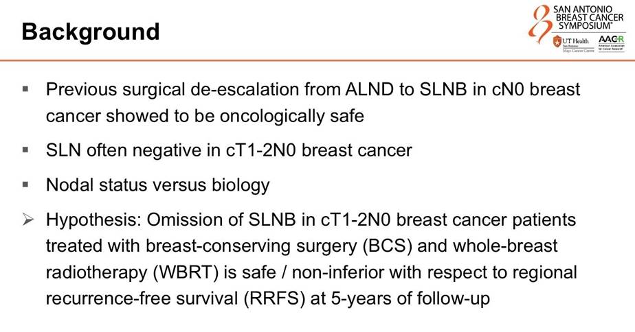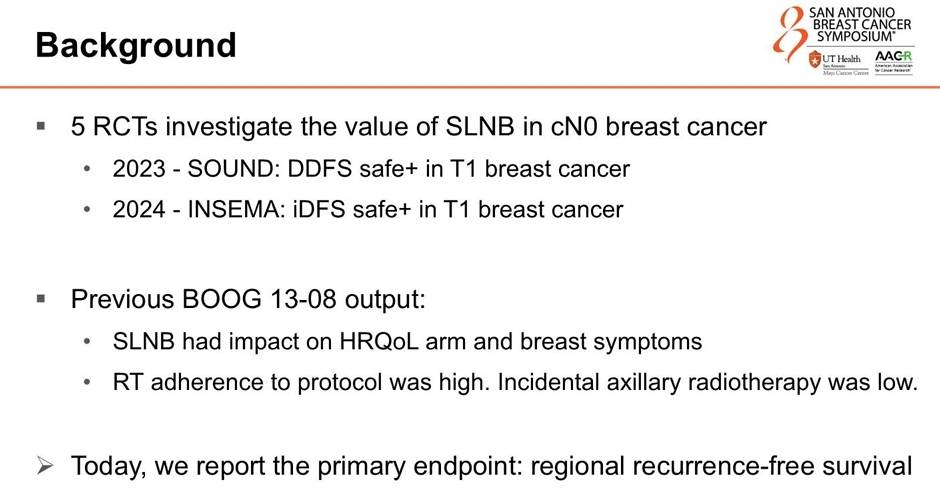 同时,我们观察到前哨淋巴结的状态对于指导全身系统治疗的决策权重正在下降。对于许多cT1-2 N0的乳腺癌患者而言,即便进行了活检,结果往往也是阴性的。正是基于这些背景,荷兰BOOG 2013-08研究应运而生。