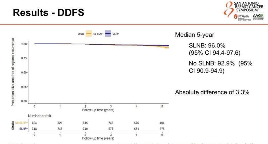 我们纳入了约1700例接受保乳治疗的早期乳腺癌患者(符合方案分析集为1572例),旨在评估这部分患者是否可以直接豁免SLNB。 结果显示,在远处无病生存期(DDFS)方面,豁免SLNB组与标准SLNB组之间没有显著差异。而在区域复发事件数上,豁免组为8例,标准组为3例,两组的绝对事件率都非常低。