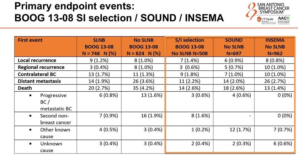 随后,为了与SOUND研究及INSEMA研究保持可比性,我们参照这两项研究的标准进行了亚组分析——即针对年龄大于50岁、肿瘤分级1-2级、激素受体阳性(HR+)的低危患者群。这个亚组占据了我们总人群的60%以上。分析结果表明,无论是SOUND、INSEMA还是我们的BOOG研究,在这类低危人群中,局部和区域复发率以及远处转移率都非常相似且处于低水平。因此,对于这一经过筛选的低危人群,豁免SLNB是安全的。