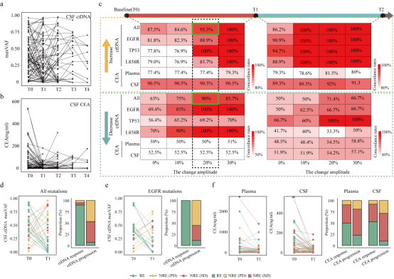 此外,该研究系统探索了CSF ctDNA 动态变化的临床阈值,当脑脊液 ctDNA 最大变异等位基因频率(maxVAF)变化幅度达到 20% 时,与临床疗效评估的一致性超 90%,据此定义的 “ctDNA 应答”(下降 20%)和 “ctDNA 进展”(升高 20%),可快速判断临床治疗的有效性。