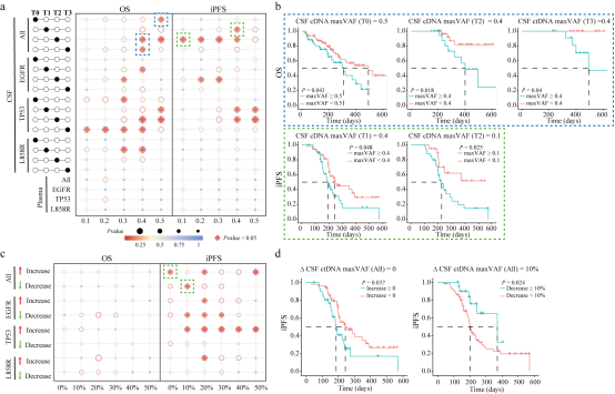 在预后评估方面,该研究构建了基于脑脊液 ctDNA 的预后预测图谱,发现基线时CSF ctDNA maxVAF>0.5 的患者生存期更短,而治疗期间 ctDNA 持续下降 10% 以上的患者,颅内无进展生存期(iPFS)显著延长。