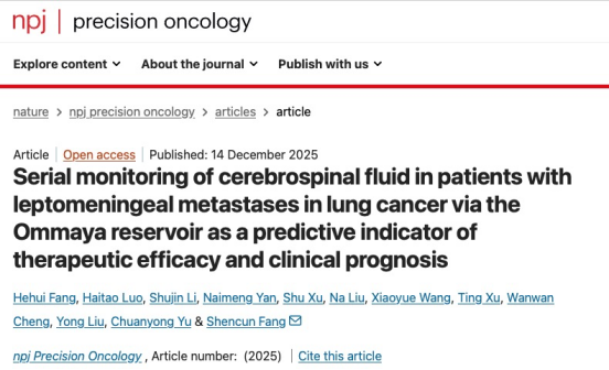 近日,南京医科大学附属脑科医院(南京市胸科医院)方申存教授团队在Nature子刊《npj Precision Oncology》(中科院 1 区 TOP)在线发表题为“Serial monitoring of cerebrospinal fluid in patients with leptomeningeal metastases in lung cancer via the Ommaya reservoir as a predictive indicator of therapeutic efficacy and clinical prognosis”的研究论文,该研究基于Ommaya囊对肺癌脑膜转移患者(LM-LUAD)进行脑脊液ctDNA(CSF ctDNA)动态监测,系统证实了CSF ctDNA在肺癌脑膜转移患者中的核心临床价值,为这类终末期肺癌患者的精准诊治提供了新的临床参考依据。