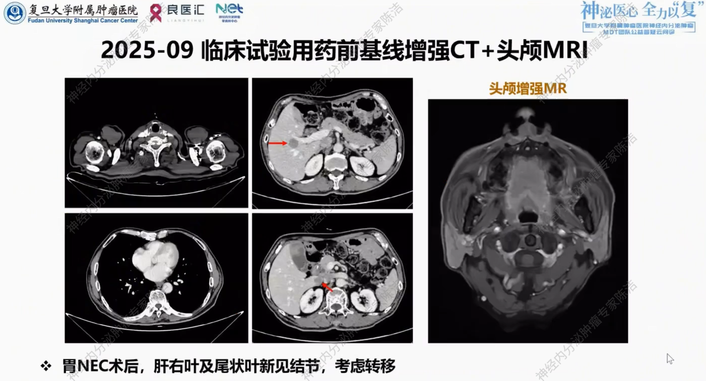 放射诊断科汤伟教授:影像学清晰记录了患者对治疗的反应:2024年11月基线时肝内多发转移,经EP方案化疗后,至2025年1月及3月,病灶几乎消失,显示对EP方案敏感。2025年9月,肝尾状叶及右叶再发结节,明确PD。患者入组ZL-1310试验,用药2周期后(2025年10月),靶病灶急剧缩小,尾状叶病灶几乎不可见,疗效评估为PR。