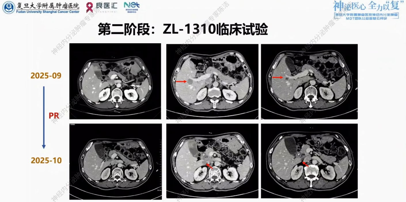 考虑到患者DLL3表达阳性,且一线化疗后进展,筛选入组ZL-1310临床试验,2025年9月23日起行C1-2程临床试验用药。2025年10月复查,提示肝内病灶肉眼可见明显缩小,评估为PR。