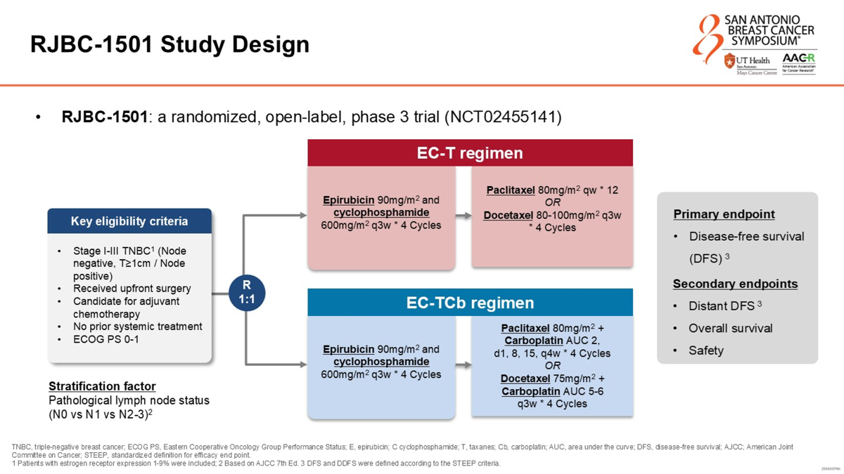 RJBC 1501试验是一项在中国19家中心开展的随机、开放标签、多中心III期临床研究。研究纳入了年龄在18至69岁之间、经组织病理学确认的侵袭性TNBC女性患者。入组标准要求患者已接受根治性手术(乳房切除术或保乳术)且适合进行辅助化疗。患者需为病理证实的淋巴结阳性,或肿瘤直径≥10 mm的淋巴结阴性患者。HER2阴性定义为IHC评分0或1,或IHC 2+且FISH检测无扩增;雌激素受体(ER)和孕激素受体(PR)阴性最初定义为<1%,后修订为允许<10%的患者入组。