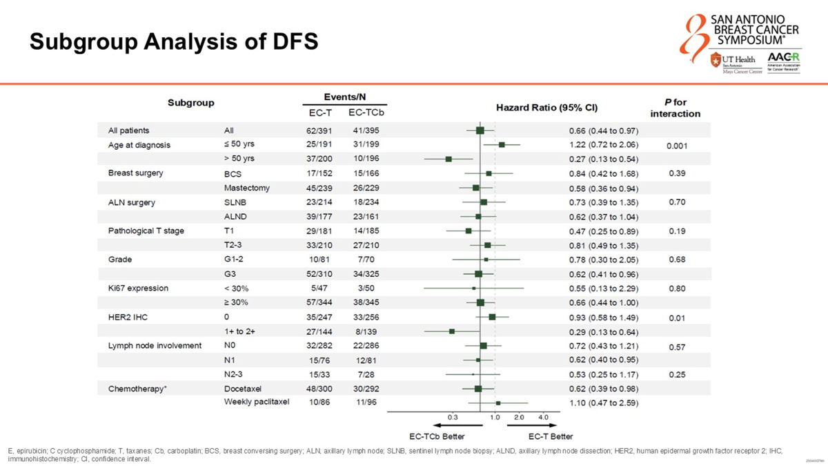探索性亚组分析揭示了疗效在不同人群中的潜在差异。虽然大多数亚组均倾向于从卡铂治疗中获益,但在年龄和HER2状态上观察到了显著的交互作用。具体而言,年龄>50岁的患者从卡铂联合治疗中获益更为显著(HR 0.27; 95% CI, 0.13-0.54),而≤50岁的年轻患者获益不明显(HR 1.22; 95% CI, 0.72-2.06;交互作用P=0.001)。在>50岁人群中,两组的3年DFS率差异巨大(87.1% vs 95.7%)。这一发现与GeparSixto研究的二次分析结果相呼应,可能与老年TNBC患者中gBRCA野生型比例较高有关,或者涉及年轻患者中免疫调节亚型较多及雌激素非基因组通路信号的潜在抵抗机制。