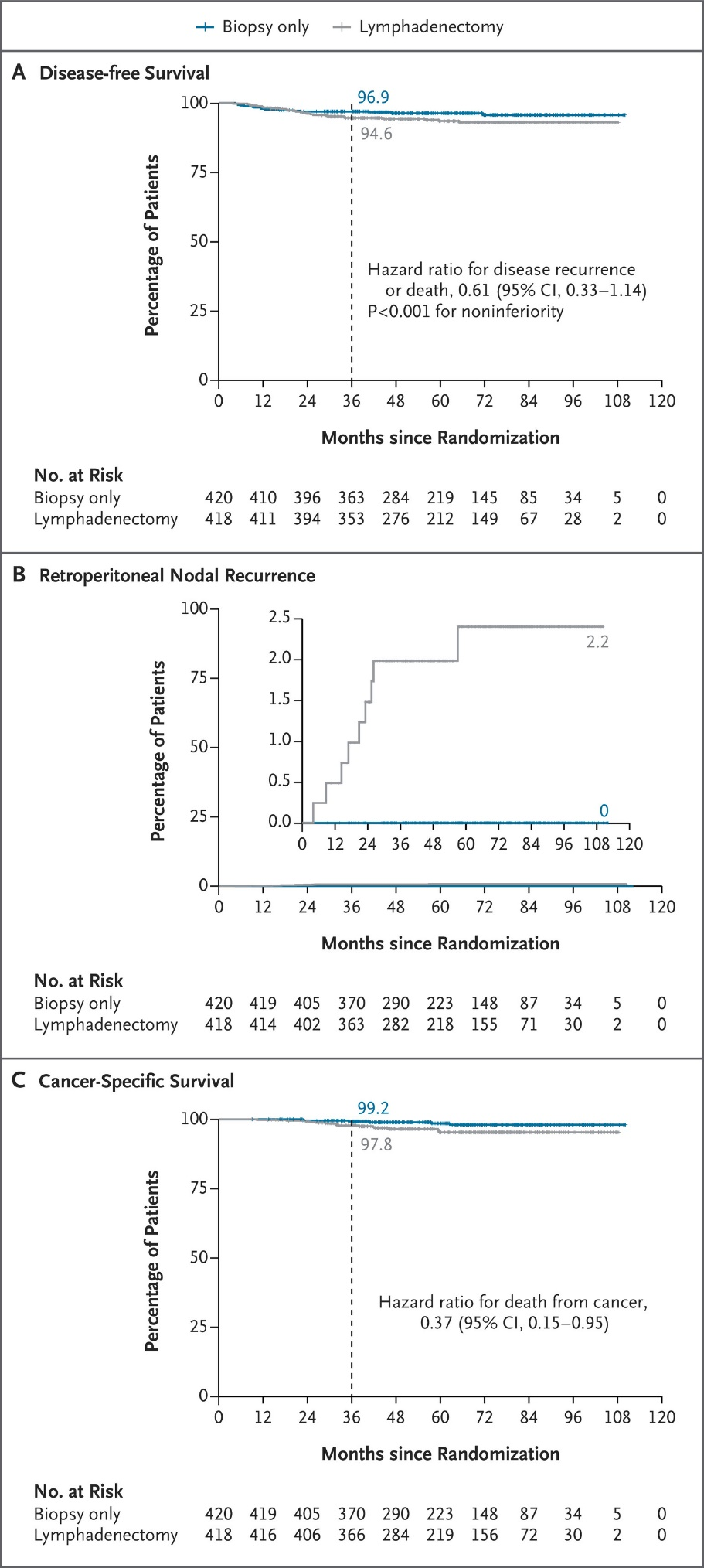 • 腹膜后复发:随访期间,活检组未观察到腹膜后淋巴结复发(0%),显著低于清扫组的2.2%(9/419);且活检组复发均为单一部位(阴道或肺部),而清扫组10例为多部位复发。