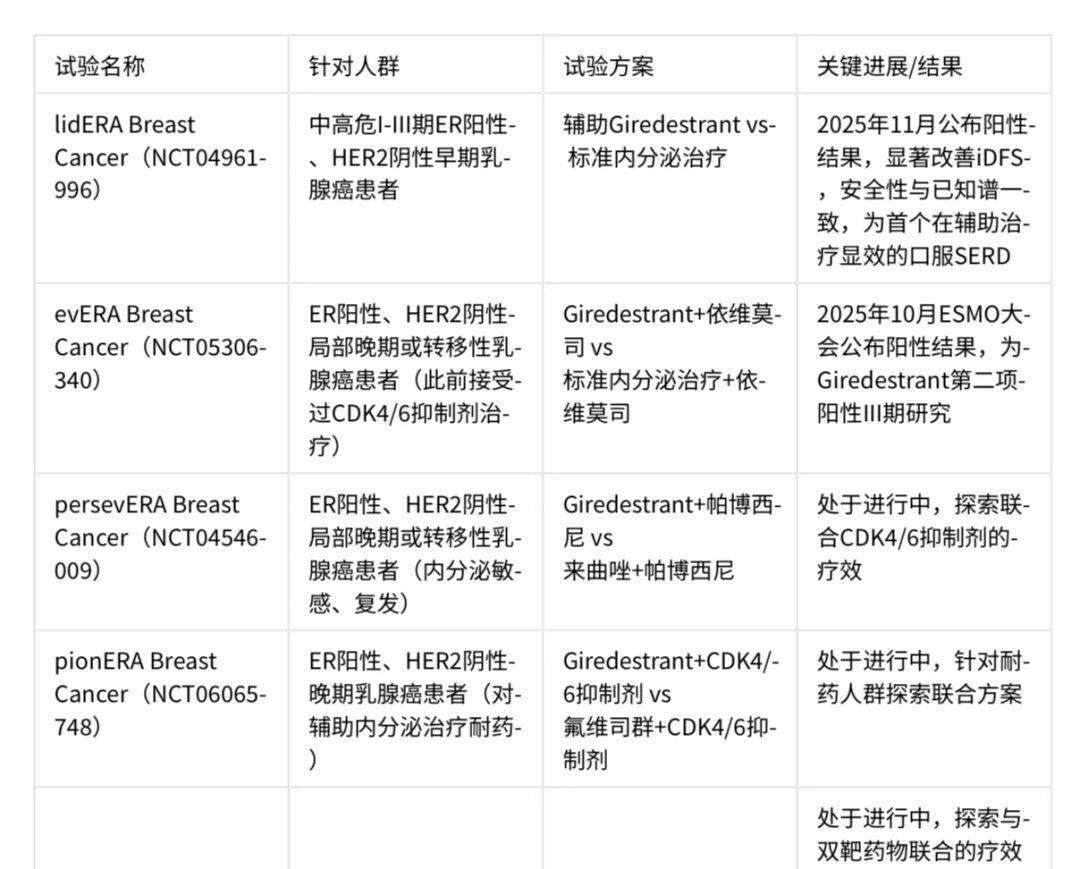 lidERA研究并非Giredestrant的首个III期胜仗——此前在2025年欧洲肿瘤内科学会(ESMO)大会上,另一项III期研究evERA已证实其在晚期乳腺癌中的疗效;而更早的II期coopERA研究还显示,它在降低肿瘤细胞增殖指标(Ki67)方面优于芳香化酶抑制剂。如今lidERA的成功,进一步完善了Giredestrant从早期到晚期、从新辅助到辅助治疗的证据链,使其有望成为覆盖ER+乳腺癌全病程的“基石药物”。