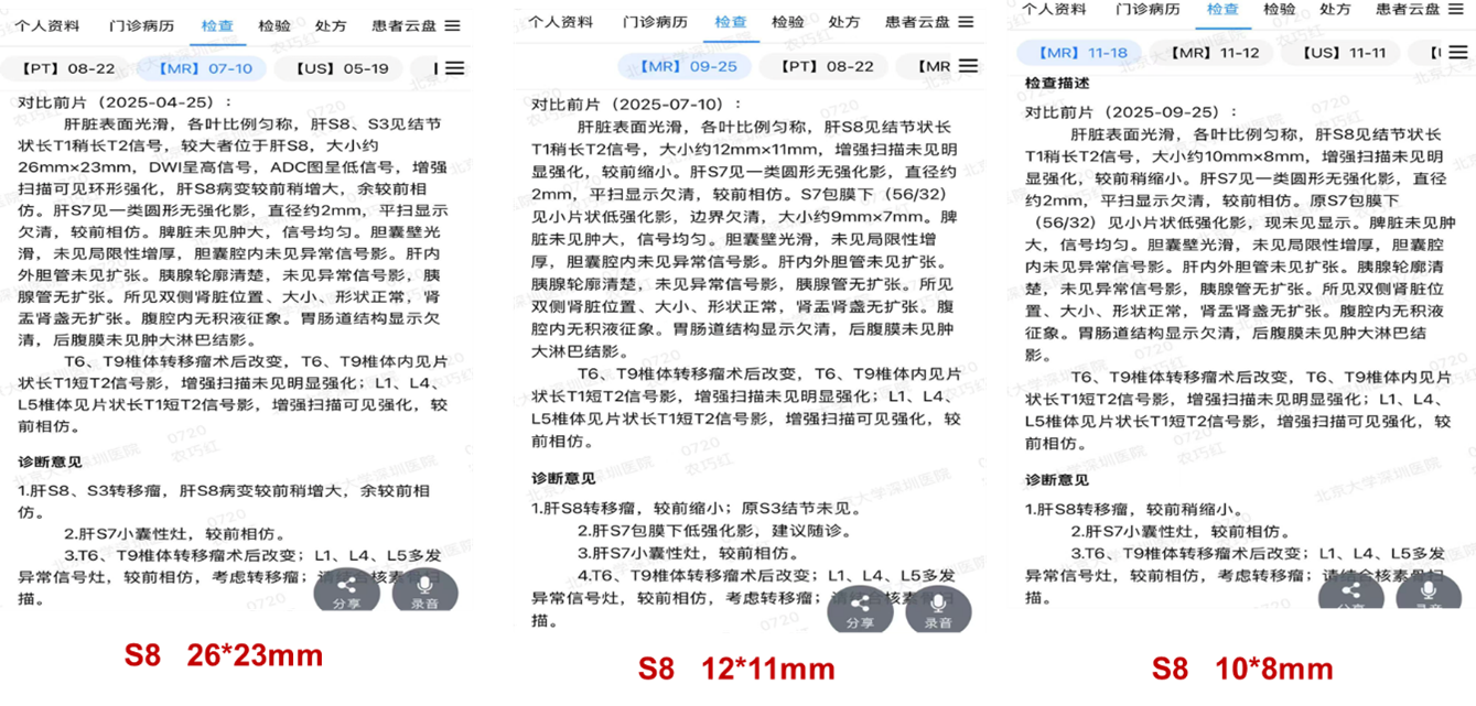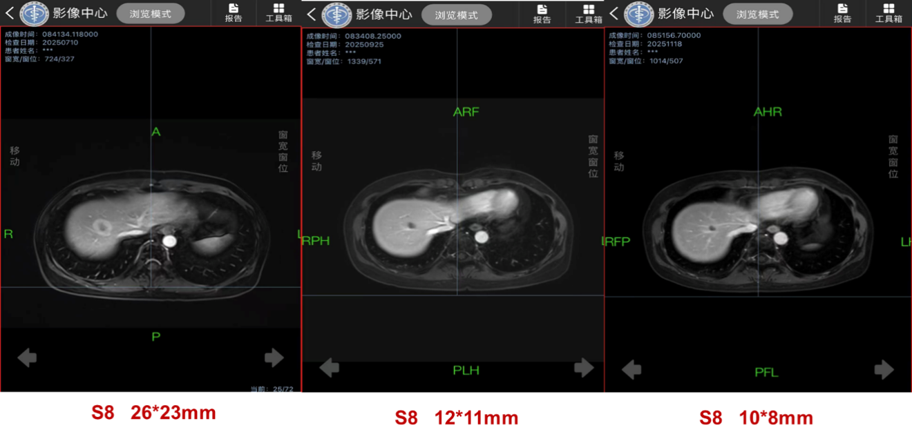 该策略疗效显著:治疗2个月后(2025年9月),肝S8转移灶从基线的26×23mm显著缩小至12×11mm,评估为部分缓解(PR);至2025年11月,病灶进一步缩小至10×8mm,维持PR。