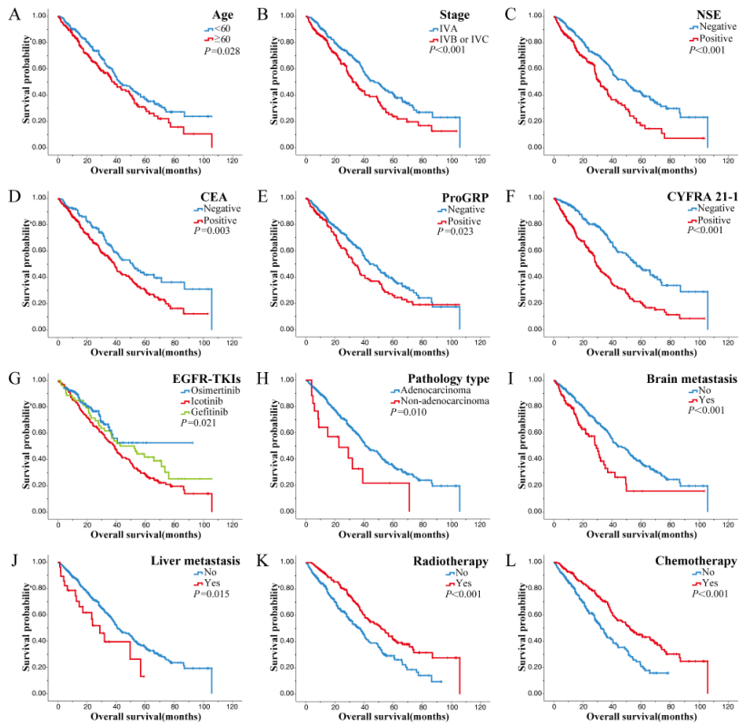 本研究探索了IV期EGFR突变NSCLC患者接受EGFR-TKI治疗的独立预后因素,其中非腺癌、肝转移、脑转移、NSE阳性和CYFRA 21-1阳性是不良预后的独立风险因素,放疗和化疗则为独立保护因素,且一线使用奥希替尼的预后优于埃克替尼和吉非替尼,亚组分析进一步验证了不同性别、年龄和分期患者中EGFR-TKI类型的预后差异。