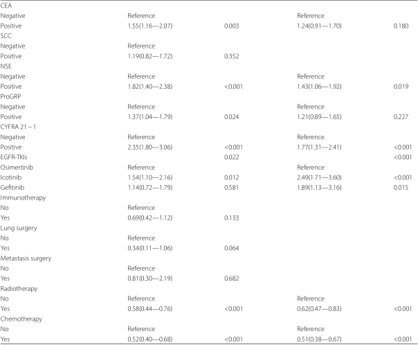 全队列中位OS为40.60个月(95%CI:34.72-46.48个月),1年、3年、5年OS率分别为87.2%、57.8%、34.0%。单因素分析及生存曲线显示,年龄<60岁、IVA级、腺癌、无肝/脑转移、NSE/CEA/CYFRA 21-1/ProGRP阴性、接受放疗/化疗及使用奥希替尼的患者OS显著更长(p<0.05)(图1)。