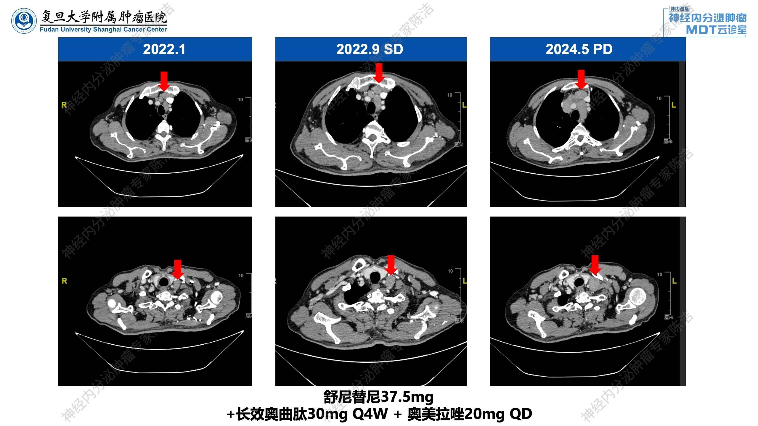 2022年1月:颈部淋巴结活检证实为神经内分泌肿瘤转移。应用舒尼替尼37.5mg QD 治疗,后患者规律复查,肿瘤疗效评价为基本稳定(SD)。