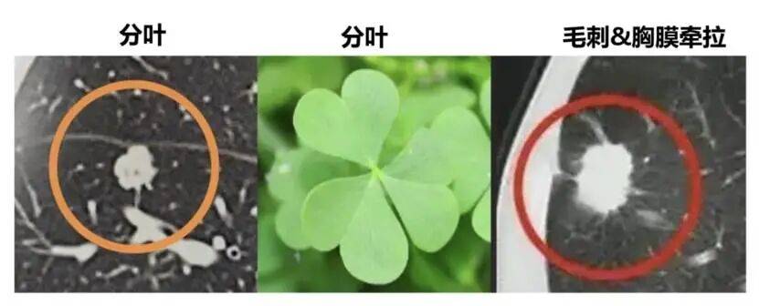 在这个过程中,就会出现各种特异性的征象,比如:分叶(三叶草)、毛刺和胸膜牵拉。