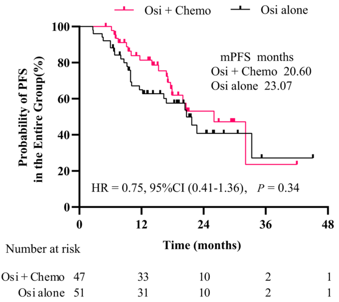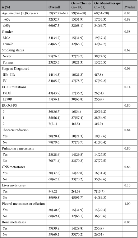 98例患者中,Osi+Chemo组47例,Osi组51例,两组基线特征均衡可比。全队列中位年龄59岁(IQR:52.7-69.0岁),女性占65.3%,不吸烟患者占76.5%;14.3%为不可切除IIIb-IIIc期,85.7%为IV期;EGFR突变类型中19外显子缺失占43.9%,L858R占56.1%;37.8%合并中枢神经系统转移,9.2%合并肝转移,30.6%合并胸膜转移或恶性胸腔积液,39.8%合并骨转移;化疗中位周期数为4(范围4-6),20.4%的患者在奥希替尼维持治疗期间接受了胸部放疗。