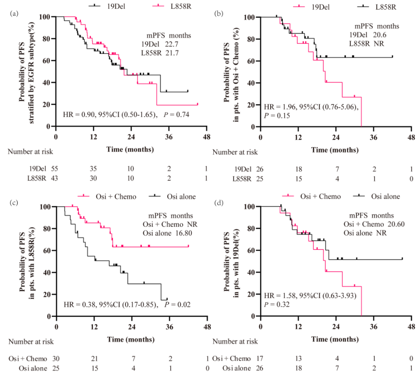 图2 患者无进展生存期(PFS)的生存曲线:(a) 按EGFR突变亚型对全队列患者进行分层分析;(b) 在奥希替尼联合化疗(Osi + Chemo)亚组中按EGFR突变亚型分层分析;(c) 针对L858R突变亚型患者的亚组分析;(d) 针对19号外显子缺失(19Del)突变亚型患者的亚组分析。