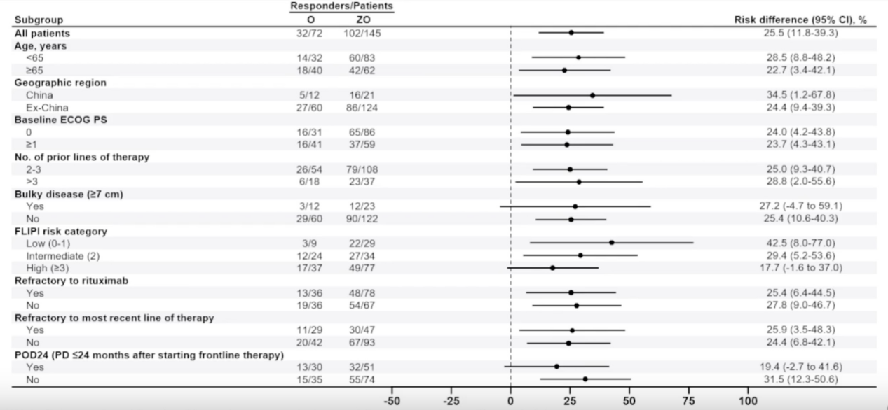 该研究结果令人鼓舞,其主要研究终点已成功达成。数据显示,与O单药组相比,ZO组无论是在ORR还是CR率方面,均表现出统计学上的显著优势。