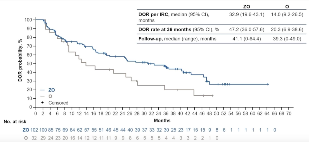 ZO组患者的缓解更加持久,其中位缓解持续时间为32.9个月,而单药治疗组仅为14个月。ZO组的36个月DoR率为47.2%,单药治疗组为20.3%。