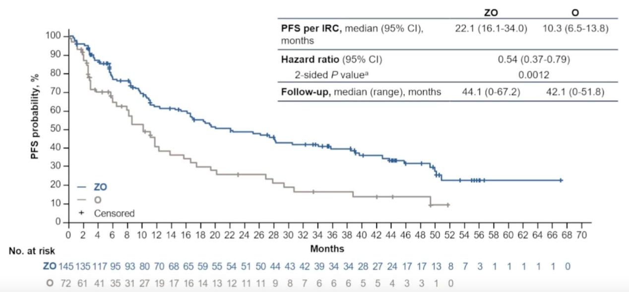 ZO组的中位PFS为22.1个月,单药治疗组为10.3个月,风险比(HR)为0.54。