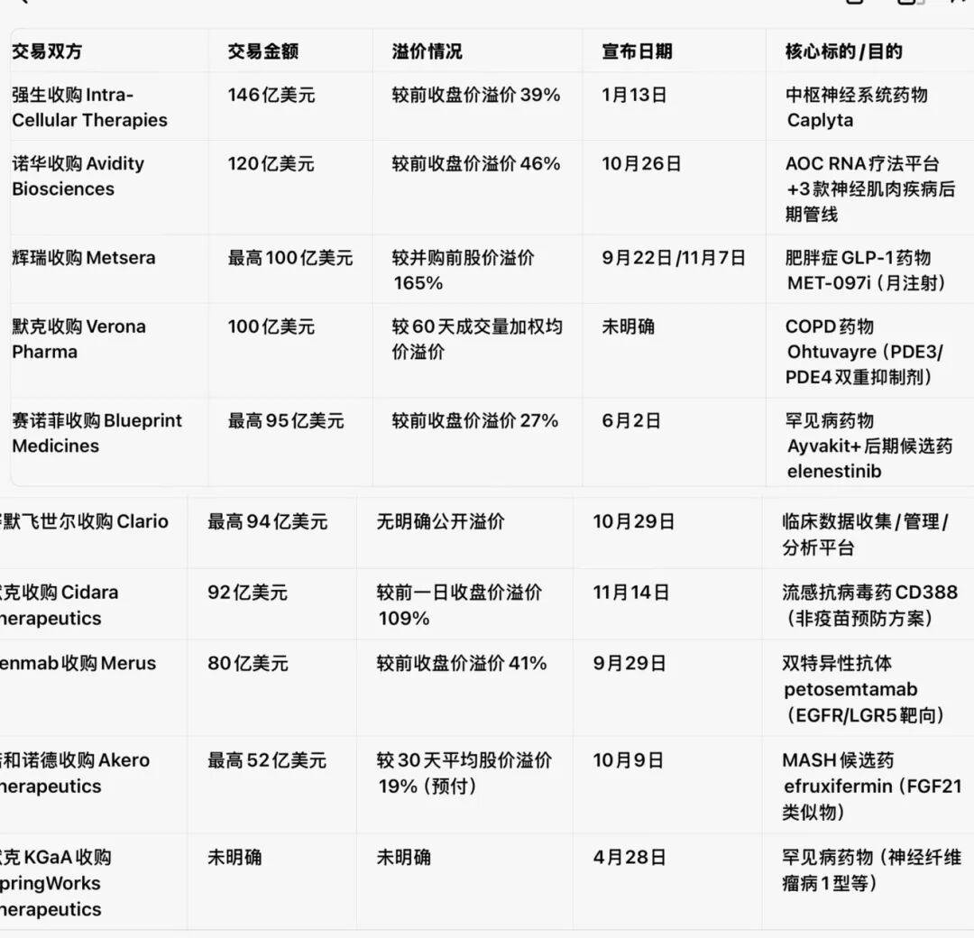竞争与博弈加剧 :优质标的引发多企业竞标(如辉瑞与诺和诺德争夺Metsera),溢价率普遍较高,部分交易溢价超100%,反映优质资产稀缺性。