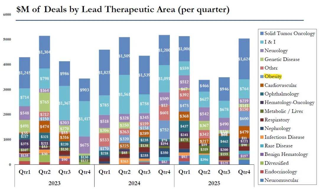 新兴热点:肥胖症(Obesity)领域交易崛起;2025年Q4肥胖症领域交易金额达600百万美元,成为该季度的突出热点——结合此前辉瑞收购Metsera布局GLP-1药物的动作,说明肥胖症已成为近年生物制药交易的新兴高价值赛道。