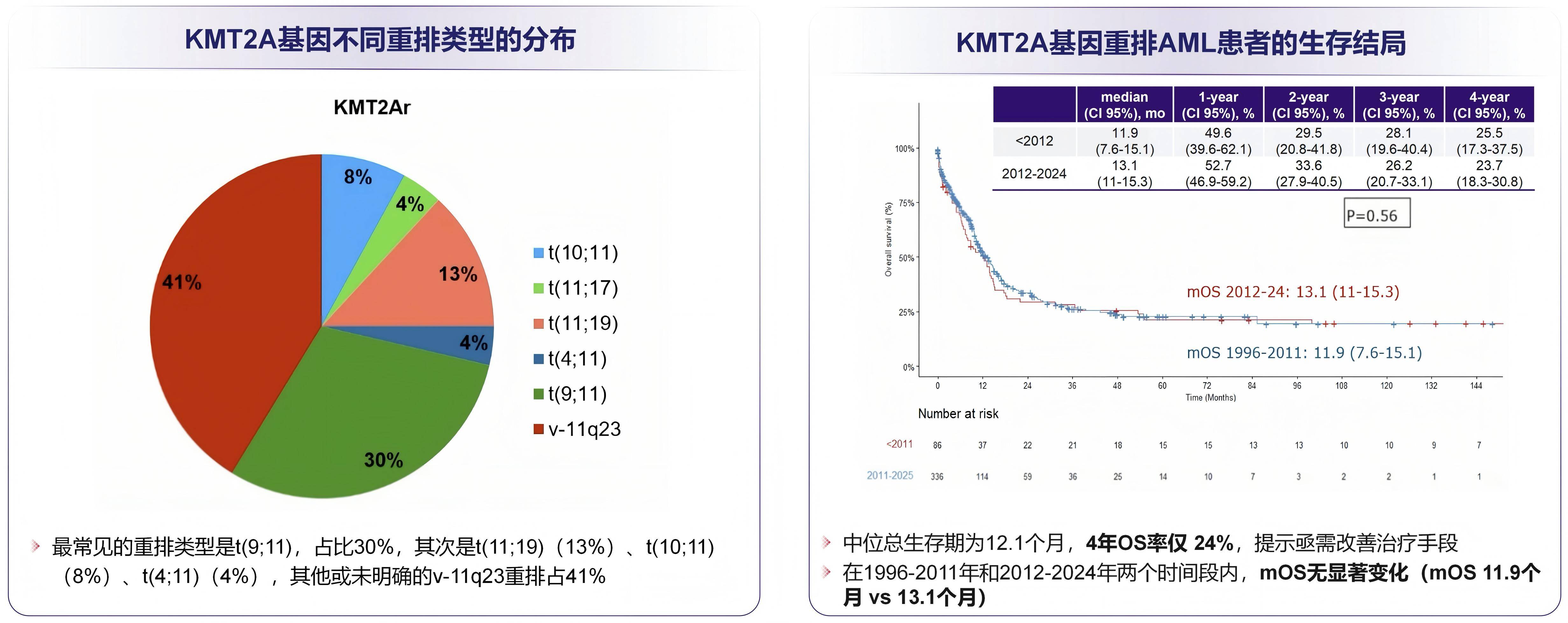 一项真实世界研究纳入了1996年至2024年在多个国家流行病学登记库录入的417例成人KMT2A重排AML患者,并分析其临床特征、治疗模式及生存预后[33]。数据显示,最常见的重排类型为t(9;11)(占30%),其次为t(11;19)(13%)、t(10;11)(8%)、t(4;11)(4%),其余或未明确的v-11q23重排占41%。KMT2A重排AML成人患者的预后较差:中位OS仅12.1个月,4年OS率仅24%。值得关注的是,即使进入2012-2024年的治疗新时期,其中位OS仅为13.1个月,与1996-2011年传统治疗阶段的11.9个月相比无显著改善(图8),表明KMT2A重排AML患者至今仍缺乏突破性的有效治疗手段,临床亟需全新的治疗策略来改善预后。