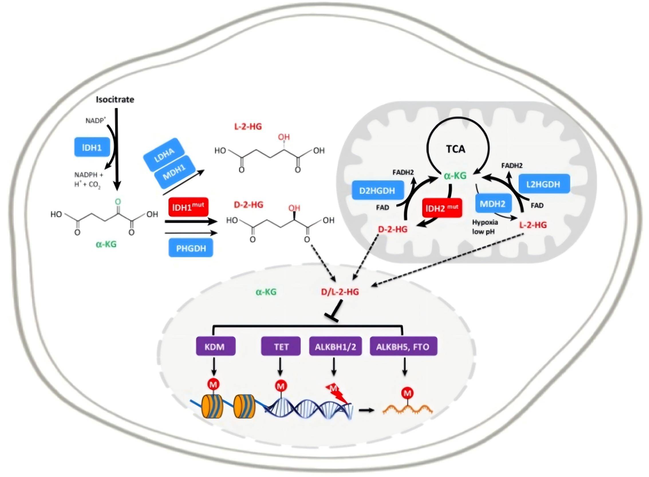 异柠檬酸脱氢酶(IDH)是三羧酸循环中的关键代谢酶,哺乳动物组织中存在IDH1、IDH2和IDH3三种类型,其中IDH1和IDH2突变与AML的发生发展密切相关,而IDH3突变较为罕见[7-10]。IDH突变驱动AML的核心机制在于:编码IDH的基因突变后,IDH突变体将α-酮戊二酸(α-KG)异常催化生成D-2-羟基戊二酸(D-2HG)。由于2-HG与α-KG结构相似,可竞争性抑制α-KG依赖性酶(包括羟基化酶、组蛋白甲基化酶、DNA甲基化酶等),导致DNA和组蛋白高度甲基化,进而阻断原始细胞分化并促进其无节制增殖,最终导致AML发生(图4)[11-13]。