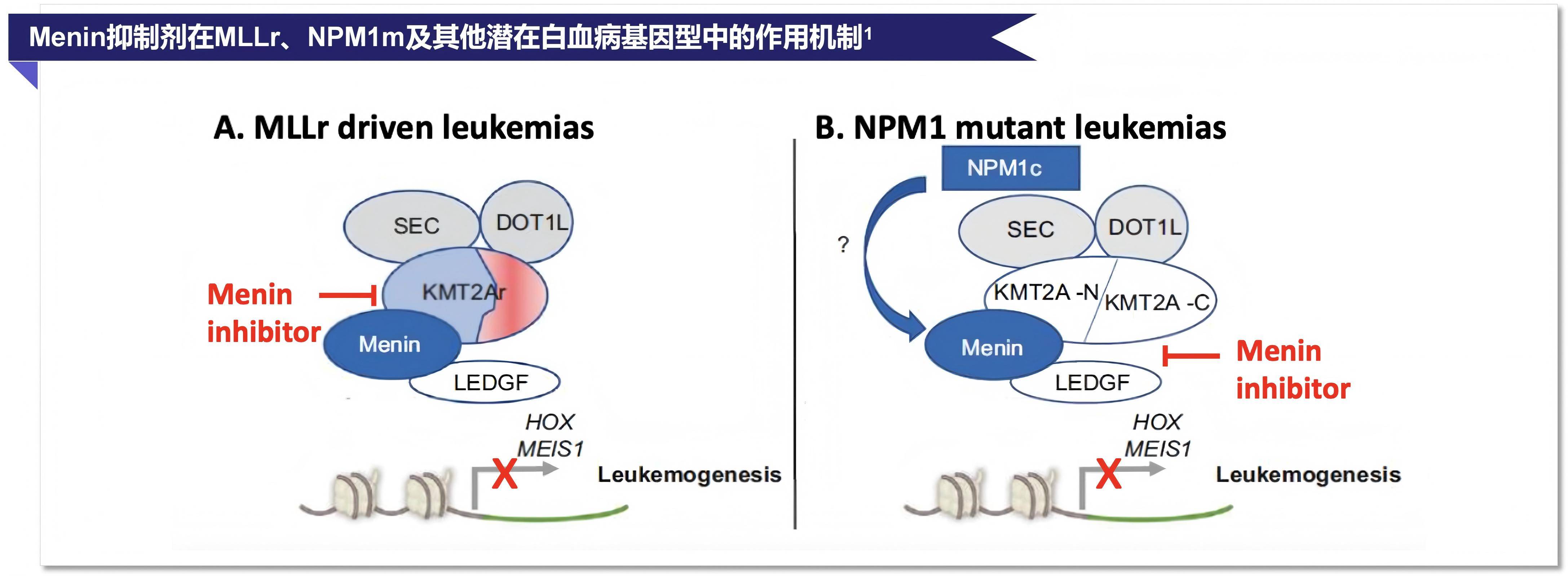 图7. Menin抑制剂在MLLr、NPM1m及其他潜在白血病基因型中的作用机制