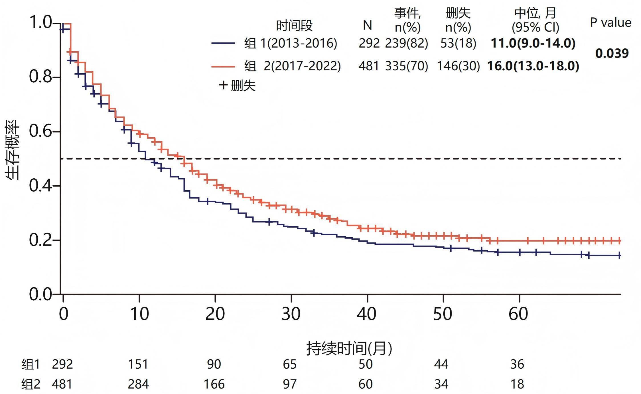 近十年,随着新一代测序等研究工具的普及,AML治疗迎来关键转折,从“一刀切”的化疗模式迈向基于基因组学的精准治疗[4]。一项多中心、前瞻性、观察性队列研究,按照诊断年份将髓系肿瘤患者分为组1(2013-2016,诸多新疗法出现前)和组2(2017-2022, 诸多新疗法出现后)[5]。数据显示,组2患者的中位生存期达到16.0个月,显著优于组1的11.0个月(图2)。
