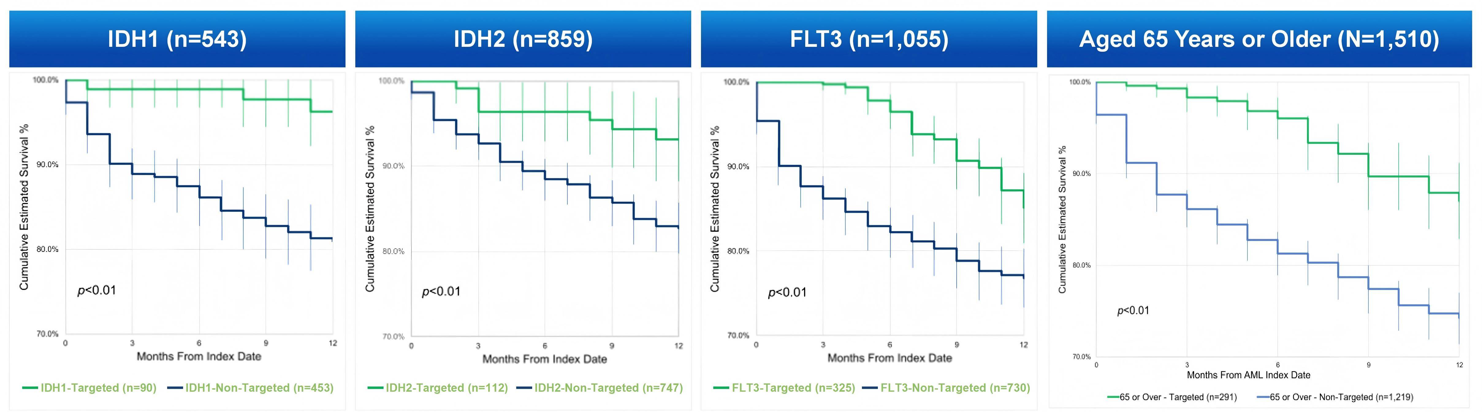 更重要的是,一项真实世界研究显示,靶向治疗的应用显著降低了AML患者死亡风险[6]:就所有突变分析,接受靶向治疗的患者第1个月死亡风险降低94%,第8个月降低27%;针对单个突变,接受靶向治疗的IDH1突变患者12个月内死亡风险降低85.1%,IDH2突变患者降低66.3%,FLT3突变患者第1个月降低96%,第7个月降低28%(图3)。