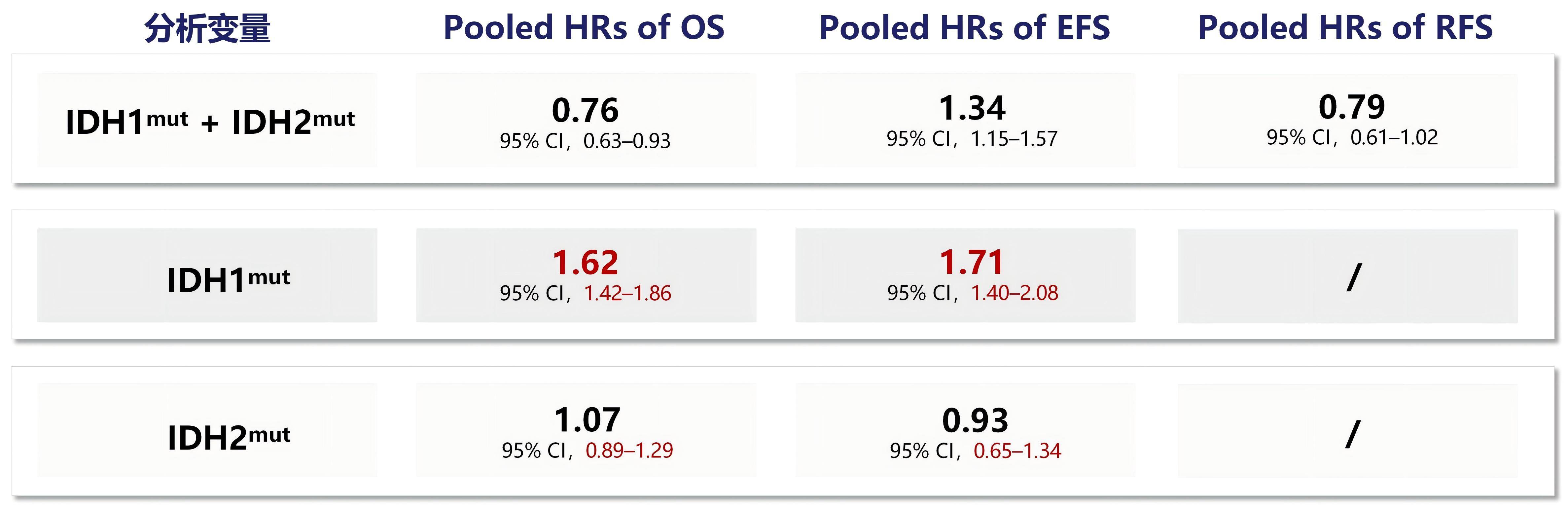 图6. IDH1&2组合分析与单独分析时的OS HR、EFS HR