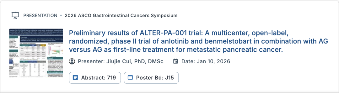 ALTER-PA-001研究初步结果:安罗替尼和贝莫苏拜单抗联合AG方案对比AG方案一线治疗转移性胰腺癌的一项多中心、开放标签、随机对照、II期临床研究