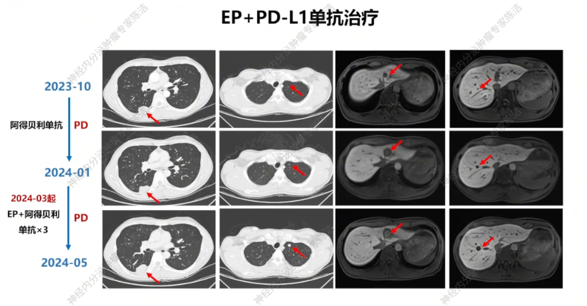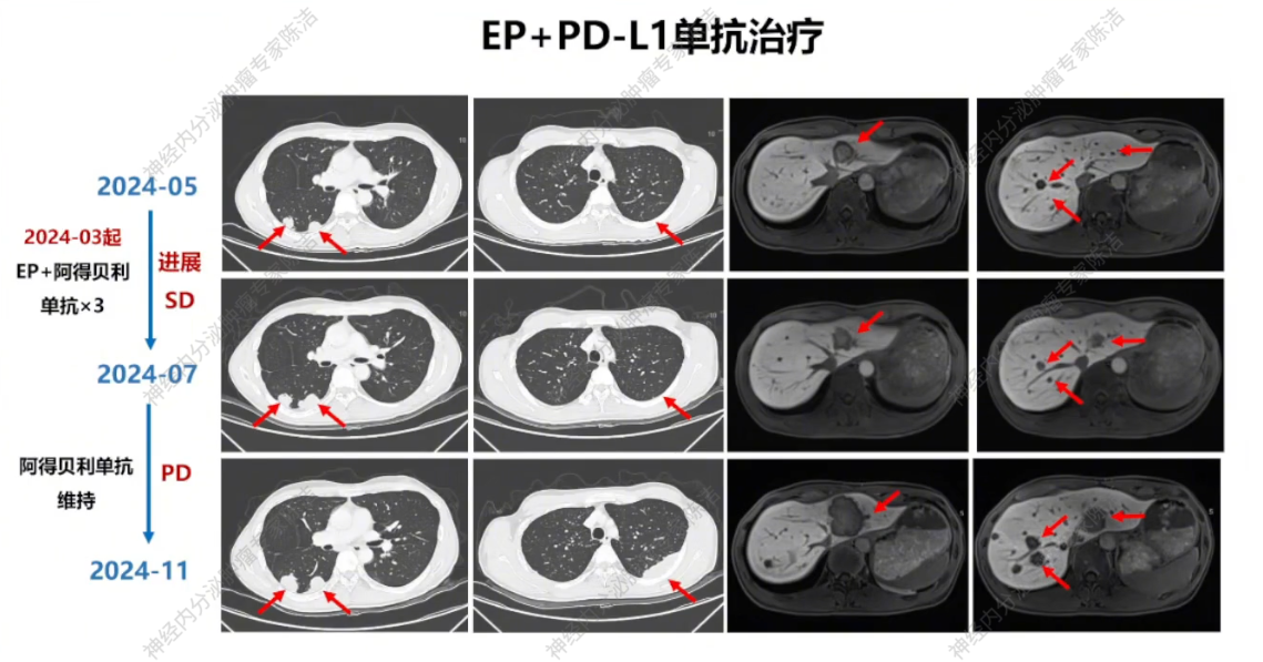 治疗2个月后,患者于2024年1月返我院复查,疗效评估PD,考虑患者Ki-67指数高且有瘤癌转化倾向,予调整方案为EP方案(依托泊苷+顺铂)联合阿得贝利单抗。但患者未立刻开始用药,于2024年3月才于外院开始使用EP方案联合阿得贝利单抗,并且,2024年3月未重新行治疗前基线检查。