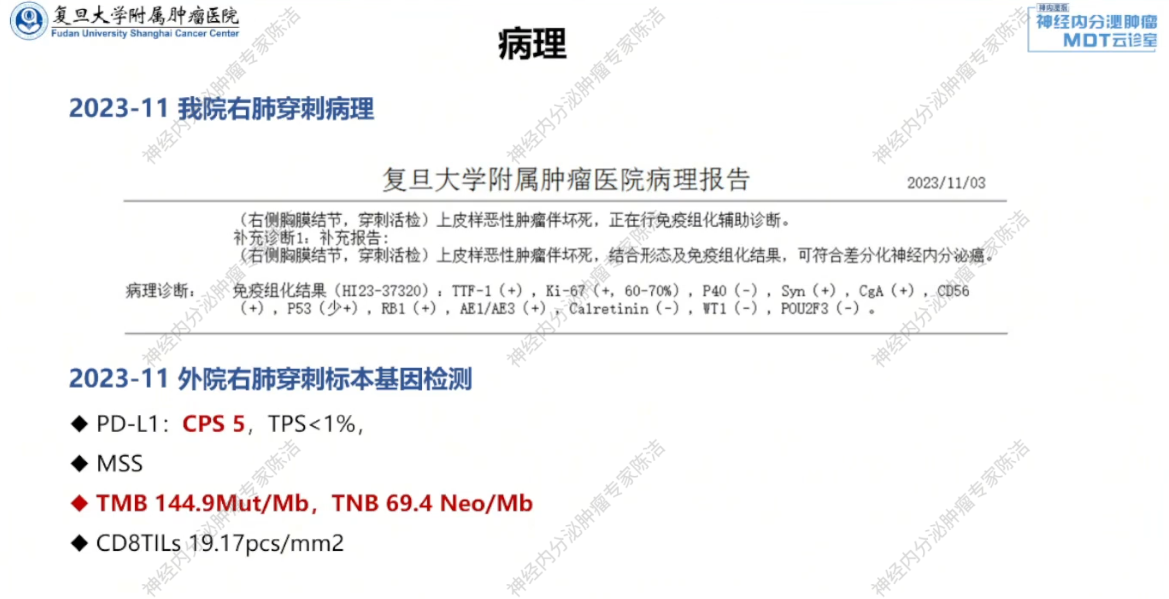 2023年11月,针对进展较快的右侧胸膜病灶进行重新活检,病理提示NEC,Ki-67热点区高达70%,提示有瘤癌转化倾向。基因检测结果显示:PD-L1 CPS评分达5,且肿瘤突变负荷(TMB, 144.9Mut/Mb)及肿瘤新生抗原负荷(TNB, 69.4Neo/Mb)高。MDT讨论认为患者可能从免疫治疗中获益,予使用PD-L1单抗阿得贝利单抗单药治疗。
