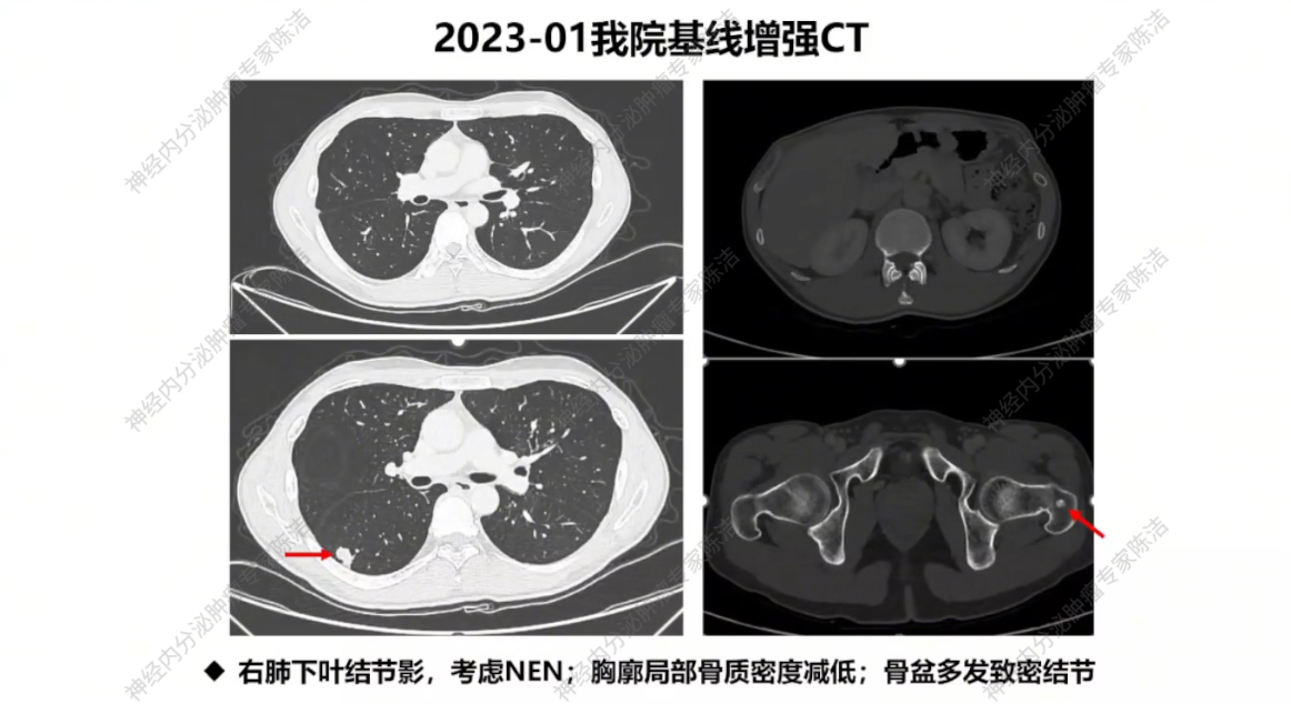 我院基线评估:患者随后转入我院,经我院病理科会诊,两部位病理均提示为高级别神经内分泌瘤,肺和骨病灶的生长抑素受体呈低表达状态。完善基线检查:胸腹盆CT及68Ga-SSA-PET/CT显示,除右肺和骨病灶外,肝脏存在多发小结节,不能排除转移可能。