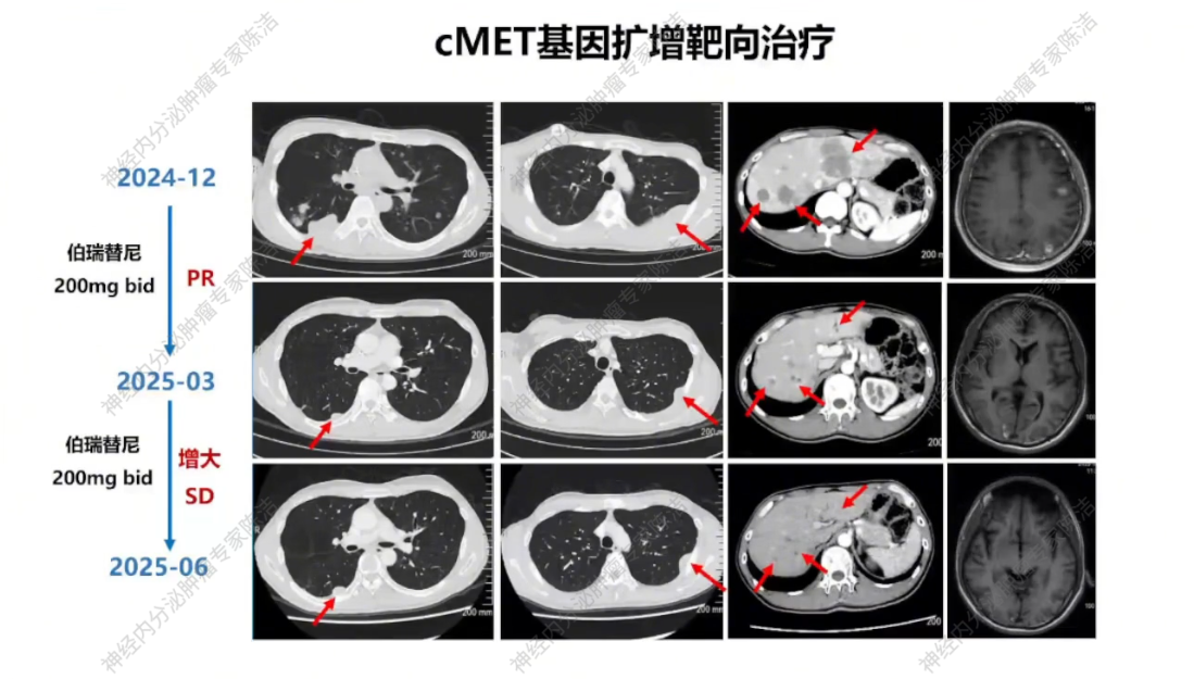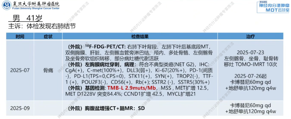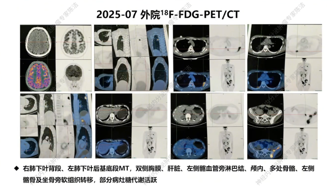 2025年7月,患者出现明显骨痛。FDG-PET/CT显示双肺、双侧胸膜、肝脏、左侧髂血管旁淋巴结、颅内及多处骨骼广泛转移,糖代谢活跃。外院对左侧胸膜病灶穿刺,病理仍提示不典型类癌,但Ki-67指数下降至20%。基因检测显示低突变负荷,但MET扩增仍高。