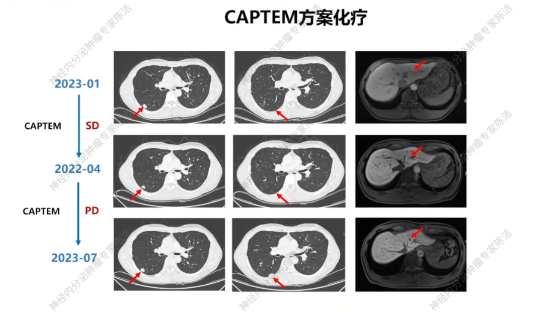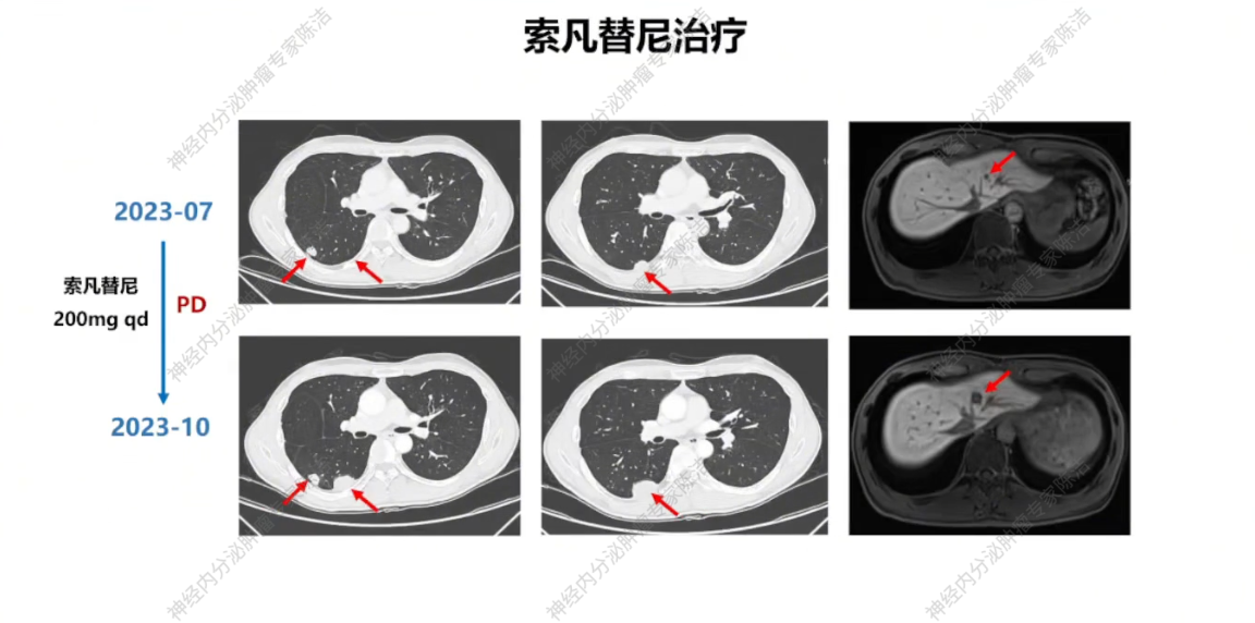 2023年1月,鉴于患者SSTR低表达,建议行CAPTEM(卡培他滨+替莫唑胺)方案口服化疗。患者接受三个周期化疗后复查,疗效评估为疾病稳定(SD)。但2023年7月,复查胸腹盆增强CT+肝普美显MR提示疾病进展(PD),方案调整为索凡替尼200mg单药治疗。该方案维持治疗三个月后,疾病再次进展。