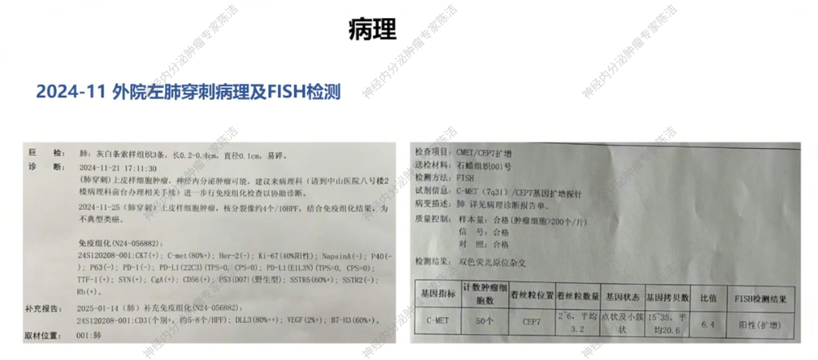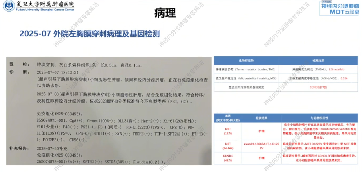 病理科黄丹教授:本病例病理诊断具有极大挑战性,且体现了肿瘤的高度时空异质性。神经内分泌肿瘤分类的关键在于形态学分化。初诊肺穿刺样本肿瘤细胞少,且穿刺挤压伤严重影响形态学观察。初诊时肺穿刺Ki-67为40%(处于灰区),而髂骨穿刺RB1阳性,综合倾向于高级别神经内分泌瘤(NET G3)。疾病进展后,Ki-67指数从40%跃升至60%—70%,按肺/纵隔标准诊断为NEC,但其分子特征无RB1缺失和P53突变,与传统小细胞癌有本质区别。2024年11月左肺穿刺PD-L1 CPS从之前的5变为0,体现免疫表型的异质性。同时发现c-MET基因扩增,这是驱动肿瘤后期变化的关键因素。2025年7月胸膜穿刺Ki-67指数回落至20%,c-MET免疫组化阳性与基因扩增匹配,且肿瘤重新出现生长抑素受体(SSTR5)的局灶阳性表达。