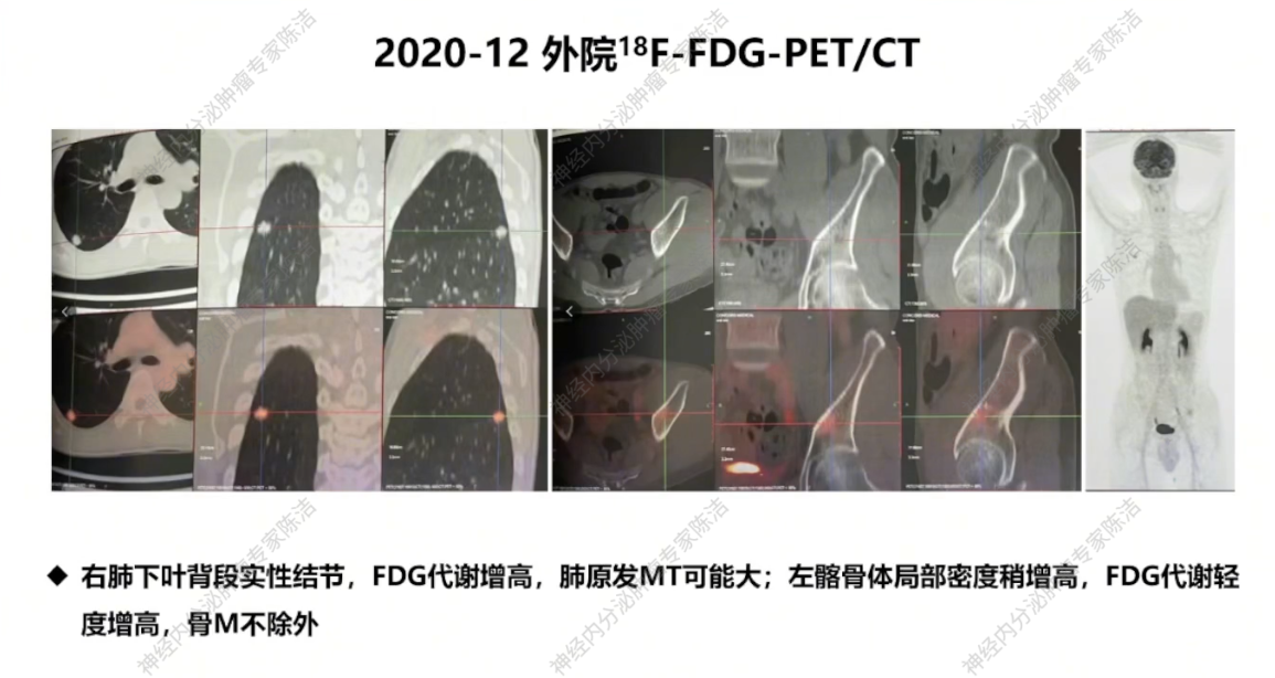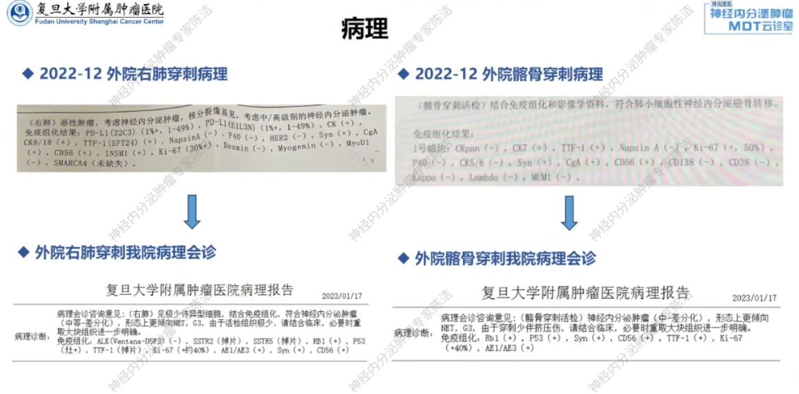 外院诊疗经过:2022年11月,患者于外院进行健康体检,胸部CT发现右肺下叶实性结节。进一步行FDG-PET-CT检查,显示右肺背段实性结节糖代谢增高,考虑恶性肿瘤;同时发现左侧髂骨骨质密度改变,考虑骨转移可能。外院随即对右肺和左侧髂骨病灶进行了穿刺活检。右肺病理提示中高级别神经内分泌肿瘤,Ki-67阳性率为30%;髋骨穿刺病理提示小细胞神经内分泌癌(NEC),考虑为转移性。