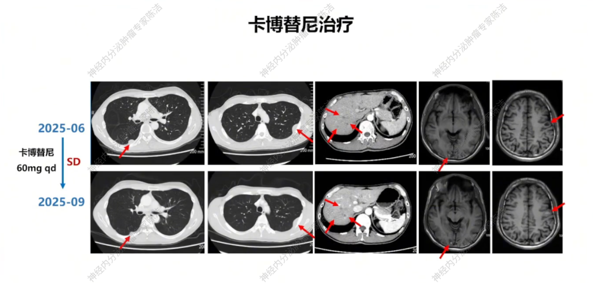 治疗三个月后复查,肺部和头部病灶明显退缩(PR)。继续维持至2025年6月,复查评估为“增大的SD”(病情趋于进展,但未达PD标准)。