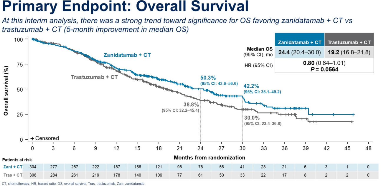 • 泽尼达妥单抗+化疗组:中位OS亦达到24.4个月,较标准治疗延长5.2个月HR=0.80,P=0.0564),展现出明确的统计学显著性趋势。