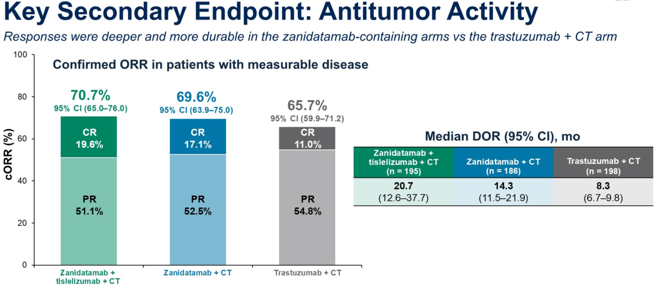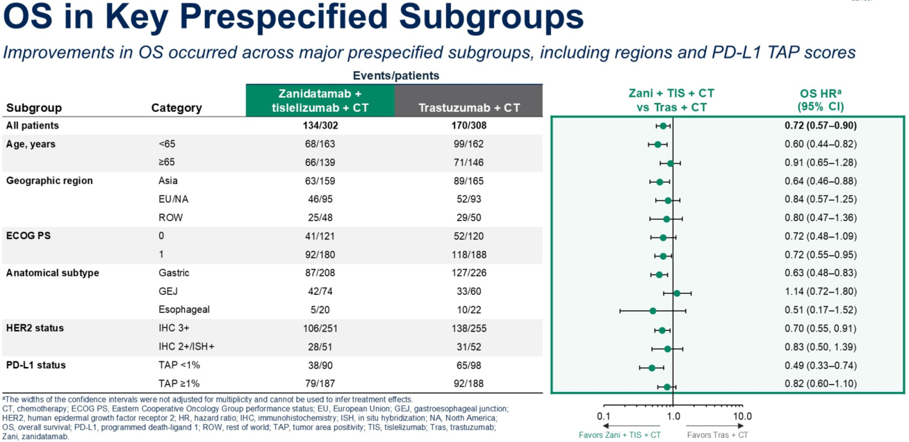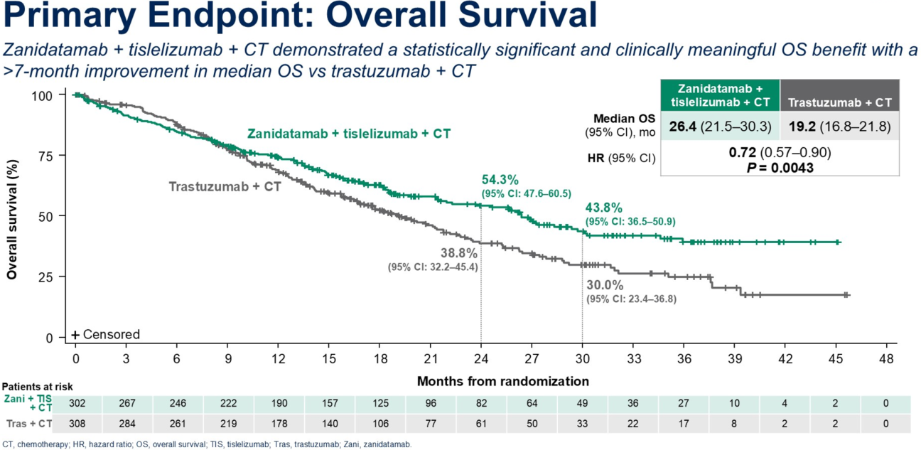 Elimova E, Rha SY, Shitara K, et al. Zanidatamab + chemotherapy (CT) ± tislelizumab for first-line (1L) HER2-positive (HER2+) locally advanced, unresectable, or metastatic gastroesophageal adenocarcinoma (mGEA): Primary analysis from HERIZON-GEA-01. 2026 ASCO GI, LBA285.